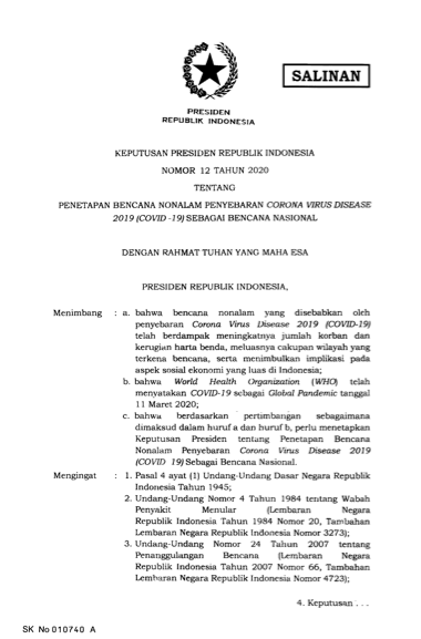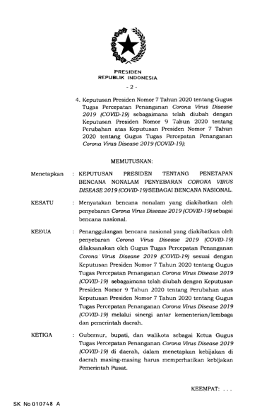 “Menyatakan bencana nonalam yang diakibatkan oleh penyebaran Corona Virus Disease 2019 (COVID-19) sebagai bencana nasional,” demikian bunyi poin pertama Keppres tersebut.