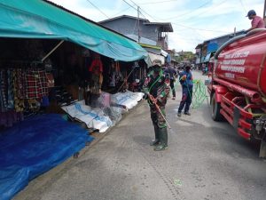 www.teras-nkri.com | NUNUKAN – Lumbis, Pencegahan dan pemutusan mata rantai penyebaran Virus Covid 19 masih terus di galakan di seluruh daerah di NKRI, tak lain adalah merupakan kehadiran Negara di dalam melindungi segenap Rakyat Indonesia, segala usaha akan dilakukan oleh Pemerintah demi memberikan Perlindungan Maksimal bagi Rakyatnya, Seperti hari ini terlihat jelas usaha Koramil 0911-05/Lbs, Polsek dan Pemerintah Kecamatan lakukan Penyemprotan Disinfektan kembali di sepanjang jalan dan fasilitas Umum lainya di seluruh Kecamatan Lumbis Kabupaten Nunukan Provinsi Kaltara,Selasa ( 14/04/2020).