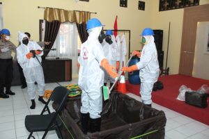 Menggunakan APD lengkap mulai dari baju, sepatu,kacamata,penutup kepala, Sarung tangan dan Masker N-95 dan cuci tangan 6 langkah sesuai protokol WHO