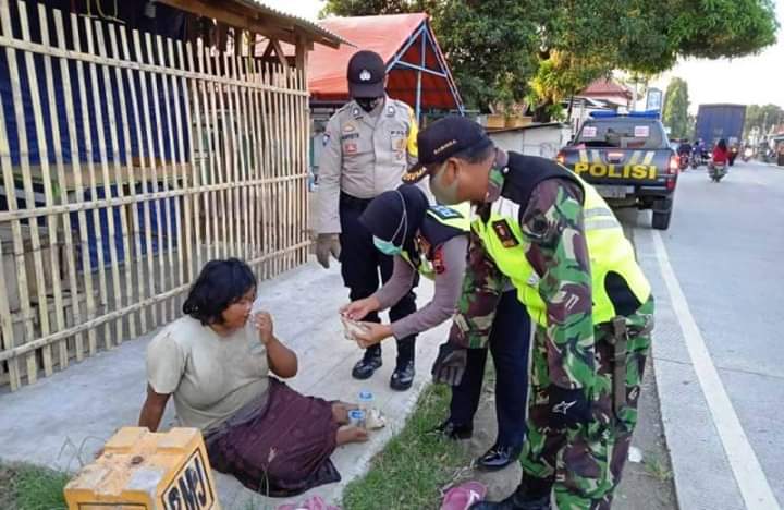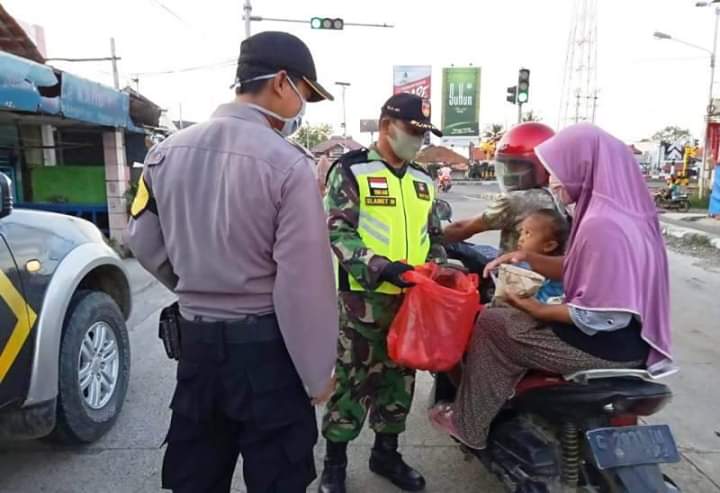www.teras-nkri.com | Brebes – Anggota TNI dan Polri dari Kecamatan Tanjung, Kabupaten Brebes, Jawa Tengah, membagikan nasi bungkus kepada segenap warga masyarakat yang melintas di pertigaan lampu merah Pejagan dan lampu merah Tanjung, serta ODGJ (Orang Dengan Gangguan Jiwa). Minggu sore (3/5/2020).