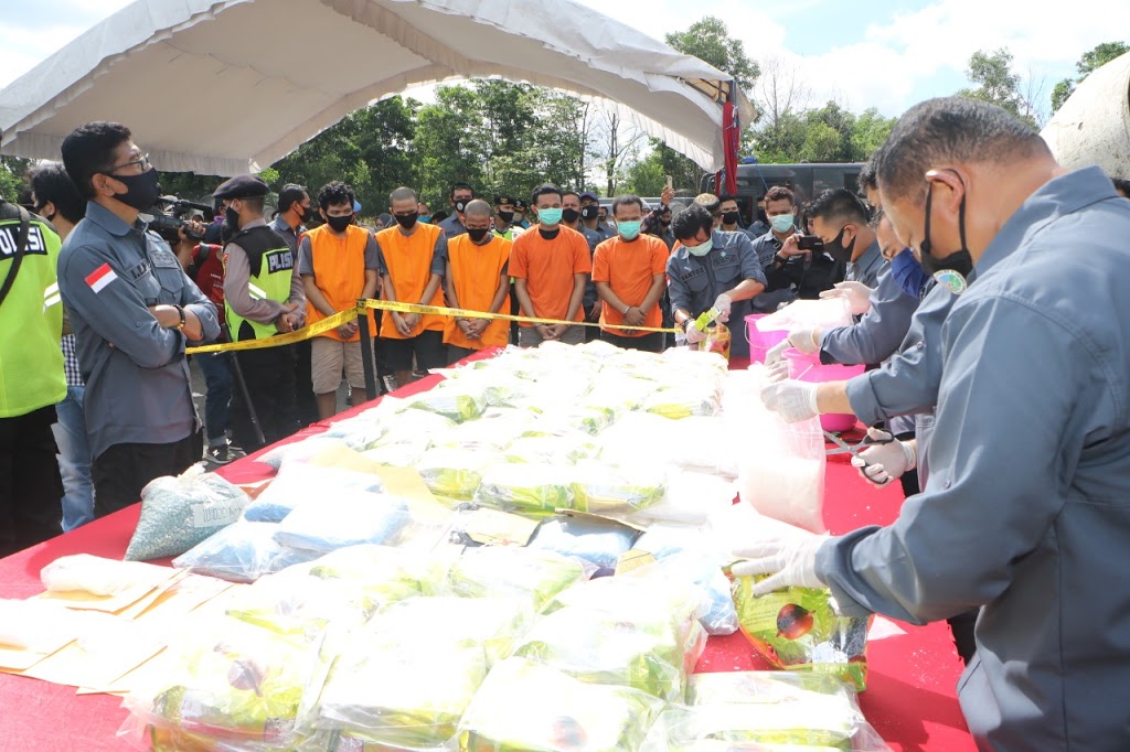 Barang bukti (BB) yang dimusnahkan dengan cara di giling menggunakan truck molen dengan di campur dengan cairan air sabun deterjen kemudian di buah di tempat galian yang di sediakan tersebut berasal dari pengungkapan 1 kasus Jaringan Internasional Malaysia – Kaltara – Kaltim – Kalsel dan Jaringan 2 kasus Jaringan Lokal dengan jumlah tersangka sebangak 6 orang.