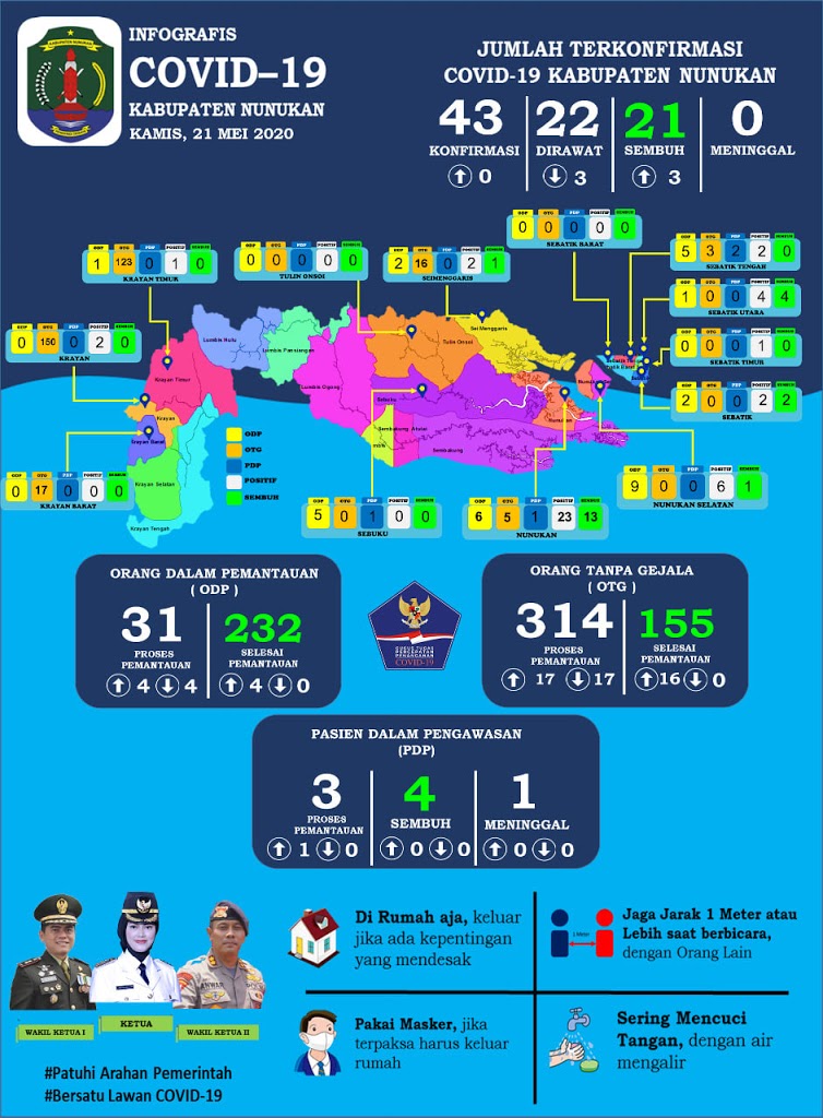 “Kembali Gugus Tugas Covid-19 Kab. Nunukan mengirimkan sampel 20 orang ke RSUD Tarakan sebanyak 13 sampel untuk follow up dan 7 diagnosa, masing – masing 2 PDP hasil surveilans aktif, 1 OTG, 2 ODP hasil pankesia, 2 ODP kontak erat klaster Temboro,” jelas Aris