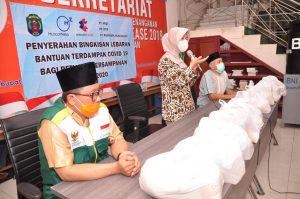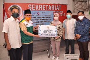 Karena masih dalam situasi pandemi covid -19, pemberian bingkisan sembako oleh bupati tetap mengikuti protokol kesehatan dan hanya dilakukan secara simbolis kepada beberapa perwakilan petugas kebersihan di Sekretariat Gugus Tugas Percepatan Penanganan Covid – 19, Kamis (21/5).