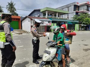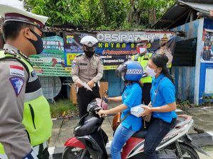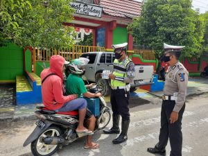 Kegiatan edukasi berupa pembagian masker dan pembagian Brosur terkait OPS Patuh Kayan 2020 dengan tema Kamseltibcar Lantas dengan Protokol Kesehatan dalam Pencegahan Covid-19.