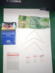 Dari lokasi, petugas mengamankan barang bukti, sebuah kotak rokok Magnum warna biru, 1 plastik klip transaran ukuran sedang kosong, 2 plastik klip transparan ukuran kecil berisikan butiran kristal warna putih yang diduga narkotika sabu, 3 pipet plastik ukuran kecil, 1 unit HP, uang Rp 20 ribu dan 1 plastik klip transparan berisikan 3 butir obat bentuk bulat.