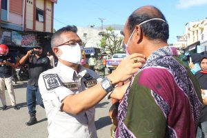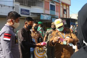 Selanjutnya membagikan masker kepada warga yang tidak memakai masker dan mengingatkan untuk selalu menggunakan masker dalam beraktivitas.