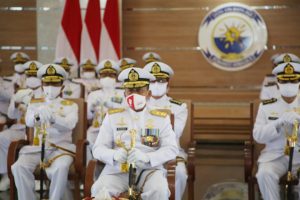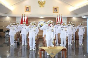 TERASNKRI.COM | Surabaya – Usai mengikuti Upacara Penaikan Bendera dalam rangka Peringatan Hari Ulang Tahun Kemerdekaan RI Ke-75 yang dipimpin oleh Gubernur Jawa Timur Khofifah Indar Parawansa di depan Gd. Grahadi, Pangkoarmada II, Laksda TNI Heru Kusmanto didampingi Kepala Staf serta Pejabat Utama Koarmada II mengikuti Pelaksanaan Upacara Detik-Detik Proklamasi Kemerdekaan RI di Istana Merdeka secara virtual, bertempat di Gedung Lounge Majapahit Mako Koarmada II, Senin (17/08/2020.