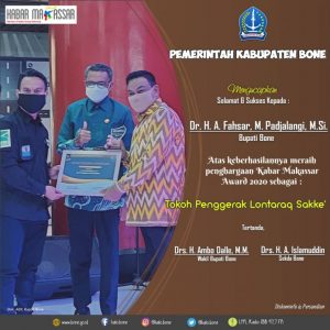 TERASNKRI.COM | Sulsel, Bone – PT Kabar Group Indonesia (Kabar Makassar) dalam rangka Hari Ulang Tahunnya ke-11 Tahun 2020 memberikan penghargaan kepada Bupati Bone Dr.H.A.Fahsar Mahdin Padjalangi, M.Si. Sebagai Tokoh Penggerak Lontara’ Sakke’ .