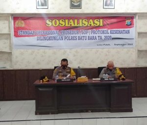 TERASNKRI.COM | Sumut, Batu Bara – Polres Batu Bara melaksanakan kegiatan sosialisasi SOP protokol kesehatan Adaptasi Kebiasaan Baru dalam pelayanan kepolisian, dimasa pandemi Covid-19 di lingkungan Polres Batu Bara dan Jajarannya TA. 2020 Polres Batu Bara.