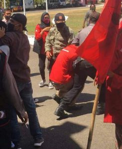 Aksi pemukulan dari aparat kepolisian satuan Kapolres Sumbawa yang diduga dari belakang barisan massa aksi. Tindakan tersebut adalah tindakan represif seorang aparat yang tidak diperbolehkan oleh konstitusi kita, hal demikian yang dilakukan terhadap kader-kader DPC GMNI. Sehingga beberapa kader dan massa aksi mengalami benjolan-benjolan dan luka dalam di bagian perut. Dan beberapa kader GMNI Sumbawa menjadi korban pemukulan oleh oknum kepolisian satuan Kapolres Sumbawa antara lain; Bung Dendy Muhazan (Ketua DPC GMNI Sumbawa), Bung Yusril (Korlap Aksi), Bung Hamran (Kordum Aksi), Bung Rahul Gunawan (Kader), bung Nindy Elma Sanjaya (Kader), Bung Reza (Kader), Bung Buyung (Kader), Bung Bohri dan Bung Iksan (Kader).