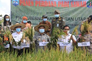 TERASNKRI.COM | Kaltara, Nunukan – Didampingi Sekretaris Provinsi (Sekprov) Kalimantan Utara (Kaltara), Plt Bupati Nunukan Faridil Murad dan sejumlah pejabat, Pjs Gubernur Kaltara Teguh Setyabudi melakukan panen padi sawah perdana Sei Apuk Desa Ujang Fatimah, Nunukan, Rabu (30/9/2020).