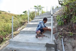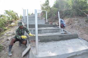 Yusuf Waly (49) tahun warga Desa Siahoni ini tampak semangat tak kenal lelah membuat tangga naik ke atas pemakaman bersama satgas TMMD.