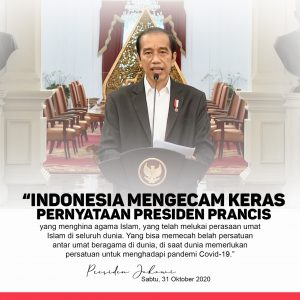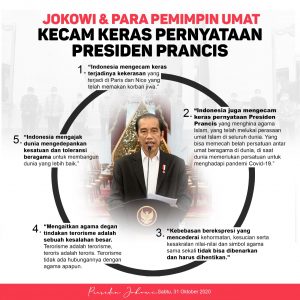 Indonesia juga mengecam keras pernyataan Presiden Prancis yang menghina agama Islam, yang telah melukai perasaan umat Islam di seluruh dunia, yang bisa memecah belah persatuan antarumat beragama di dunia, di saat dunia memerlukan persatuan untuk menghadapi pandemi COVID-19,” tegas Presiden.