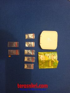Selain itu, petugas juga menemukan barang bukti, kotak kecil warna putih bertuliskan Pixy yang di dalamnya terdapat 1 lembar kertas berwarna hijau yang berisikan 5 lembar plastik klip transparan yang berisikan kristal warna putih yang diduga narkotika jenis sabu.Kemudian, 2 lembar plastik klip transparan kecil kosong.