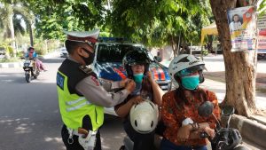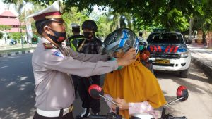 Satlantas Polres Sumbawa Polda NTB Bagi – bagi Helm Gratis Kepada Pengendara Tertib Berlalu Lintas dan Tertib Prokes