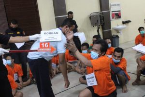 Sebanyak 22 tersangka yang juga tahanan dalam pelbagai kasus hukum di RTP Polres Serdang Bedagai digiring ke dalam Aula Patriatama tempat berlangsungnya rekonstruksi, Kamis (12/11/2020) pagi.
