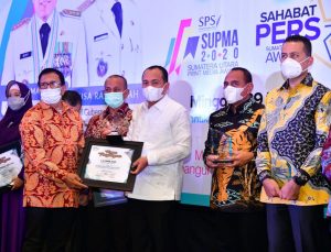 TERASNKRI.COM | Sumut, Medan – Bupati Batu Bara Ir H. Zahir M.AP bersama Gubsu Edy Rahmayadi dan Wagubsu Musa Rajekshah menerima Penghargaan Sahabat Pers tahun 2020 dari Serikat Perusahaan Pers ( SPS ) yang diserahkan oleh Wakil Ketua Dewan Pers Pusat Hendry CH Bangun dalam acara malam penganugrahan SPS Minggu malam (29/11/2020) di Hotel Santika Medan.