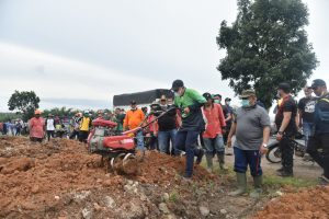 Bupati Batu Bara Ir H Zahir juga dalam kesempatan ini langsung mengelola tanah menggunakan Cultyvator dan menanam sejumlah tanaman pendamping beras.