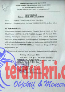 TERASNKRI.COM | NTT, Manggarai – Dalam Surat Pengumuman Nomor: RSUD.445.6/21/I/2021 tentang Penggunaan Jasa Layanan IGD BLUD RSUD dr. Ben Mboi, tertanggal 13 Januari 2021.