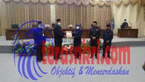 Sebagai gantinya, Wakil Bupati Sugianto Panala Putra menyerahkan dokumen pidato jawaban bupati kepada Ketua DPRD Ir. Hj. Mery Rukaini, M.IP