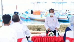 TERASNKRI.COM | JAKARTA – Presiden Joko Widodo berdialog dengan para nelayan Provinsi Maluku untuk mengetahui situasi yang dihadapi nelayan setempat di kala pandemi saat ini. Dialog tersebut berlangsung di Dermaga Huseka’a Hitu, Kabupaten Maluku Tengah, pada Kamis, 25 Maret 2021.