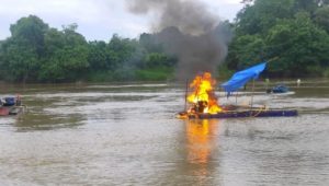 Kali ini, Kanit Reskrim Polsek Kuantan Mudik, Aiptu Hainur Rasyid SH bersama anggota lainnya berhasil merusak dengan cara membakar 4 rakit PETI yang sedang beroperasi di sepanjang aliran sungai kuantan Desa Rantau Sialang Kecamatan Kuantan Mudik, Kabupaten Kuantan Singingi (Kuansing), Riau, Ahad (4/4/2021).
