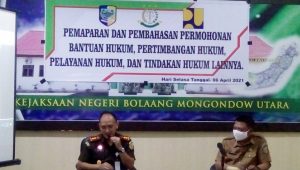 TERASNKRI.COM | BOLMUT, SULUT – Dinas Pekerjaan Umum dan Penataan Ruang Kabupaten Bolaang Mongondow Utara melakukan Pemaparan dan Pembahasan Permohonan Bantuan Hukum, Pertimbangan Hukum, Pelayanan Hukum dan Tindakan Hukum lainnya kepada bidang Perdata dan Tata Usaha Negara Kejaksaan Negeri Bolmut, Selasa (6/4/2021).
