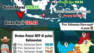 Jika dilihat perbandingan NTP seluruh Indonesia maka Provinsi Riau masih bertahan di posisi pertama dan merupakan provinsi dengan NTP tertinggi yakni mencapai 134,54, sekalipun sedikit lebih rendah di banding NTP Riau pada Bulan Maret yang mencapai 137,64. Sementara Provinsi Bali masih berada pada posisi terendah dengan nilai NTP sebesar 92,12. Untuk Provinsi Kalimantan Utara secara nasional juga masih berada pada posisi ke 14 dengan NTP sebesar 104,86 dan masih berada pada urutan terakhir dari lima provinsi yang ada di Pulau Kalimantan.