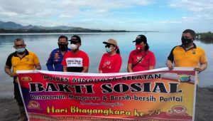 “Dalam rangka menyambut Hari Bhayangkara ke 75 pada tanggal 1 Juli nanti, jajaran Polres Minsel bersama TNI, Pemerintah dan masyarakat, mengadakan kegiatan bakti sosial diantaranya penanaman mangrove untuk mencegah abrasi pantai, membersihkan pesisir pantai, juga kerja bakti di rumah ibadah. Hal ini untuk lebih mempererat hubungan silaturahmi Polri dengan masyarakat guna mendukung terciptanya stabilitas kamtibmas,” ujar Kapolres Minsel AKBP S. Norman Sitindaon, SIK.