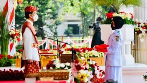 TERASNKRI.COM | JAKARTA – Presiden Joko Widodo memimpin upacara Peringatan Detik-Detik Proklamasi Kemerdekaan Republik Indonesia yang digelar di halaman Istana Merdeka, pada Selasa, 17 Agustus 2021. Kepala Negara hadir bersama Ibu Negara Iriana Joko Widodo dan didampingi oleh Wakil Presiden Ma’ruf Amin beserta Ibu Wury Ma’ruf Amin.