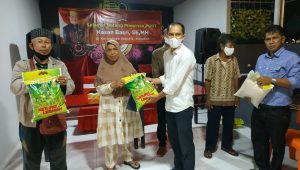 Pada kesempatan silaturahmi tersebut Senator Hasan Basri melalui Afandi menyerahkan secara simbolis bingkisan Sembako berupa beras kepada yang warga yang berhak menerima. (TN/Srd)