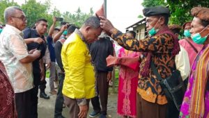 terasnkri,com | Maluku, Namlea-Kedatangan Ramly Umasugi SPi.MM sebagai Bupati Kabupaten Buru beserta Sekda dan rombongan ke Desa Selwado Kecamatan Aerbuaya dalam rangka pelantikan Penjabat Kepala Desa, Ramly disambut dengan prosesi adat oleh para tetua adat dengan menyarungkan lestari ke kepalanya. Sabtu (27/11/21)