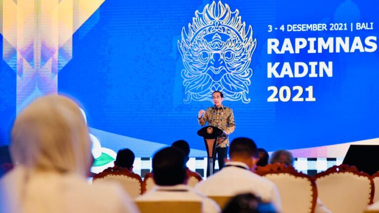 TERASNKRI.COM | BALI – Presiden Joko Widodo membuka Rapat Pimpinan Nasional (Rapimnas) Kamar Dagang dan Industri (Kadin) Indonesia Tahun 2021 yang digelar di Bali Nusa Dua Convention Center (BNDCC), Kabupaten Badung, Provinsi Bali, pada Jumat, 3 Desember 2021. Dalam sambutannya, Presiden meminta dukungan Kadin untuk mendetailkan kebijakan-kebijakan pemerintah, utamanya yang akan menjadi fokus Indonesia pada presidensi G20 yang telah dimulai sejak 1 Desember 2021.