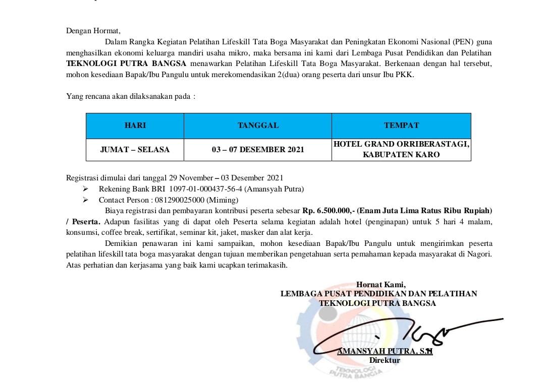 Dengan rincian, per peserta kepala Desa diwajibkan mentrasfer uang sebesar enam juta setengah ke rekening pribadi pihak jasa ketiga bernama Armansyah Putra dari Lembaga Pusat Pendidikan dan Pelatihan Teknologi Putra Bangsa.