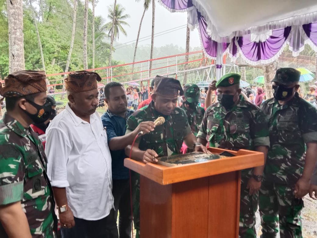 Peresmian Jembatan NKRI 04 oleh Danrem 151/ Binaiya, ditandai dengan penandatangan prasasti dan pengguntingan pita serta penanaman pohon pinang.