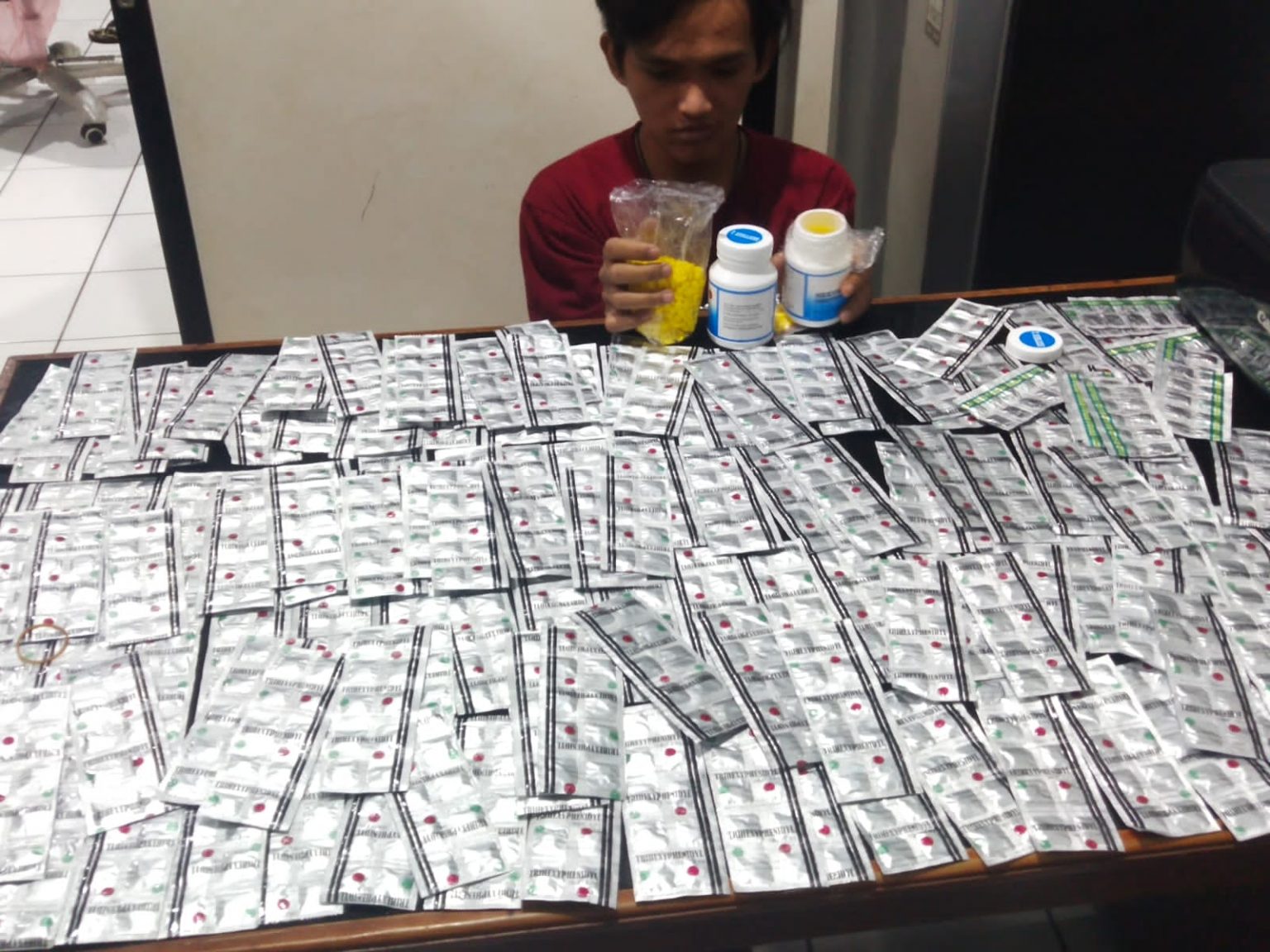 AKP Shilton, S.IK M.H menjelaskan pada saat mengamankan seorang laki-laki US (25) kemudian di lakukan pengeledahan dan didapati barang bukti berupa 10 (sepuluh) Lempeng Obat yang diduga jenis TRAMADOL HCI yang tiap lempengnya berisi 10 (sepuluh) butir dengan jumlah keseluruhan 100 (seratus) butir, 5 (lima) Lempeng Obat yang diduga jenis TRIHEXYPENIDYL yang tiap lempengnya berisi 10 (sepuluh) butir dengan jumlah keseluruhan 50 (lima puluh) butir, 1 (satu) bungkus plastik klip bening yang didalamnya berisi 44 (empat puluh empat) butir pil warna kuning diduga obat jenis HAXYMER, 1 (satu) bungkus plastik klip bening yang didalamnya berisi 73 (tujuh puluh tiga) butir pil warna kuning diduga obat jenis HAXYMER, Uang Rp.50.000,- (lima puluh ribu rupiah) dan 1 (satu) buah HP merk XIAOMI warna hitam. Kemudian dilakukan penggeledahan di Kontrakan Sdr. UNGGUL SATRIYO YUWANDA Bin YUDA WIBAWA dan didapati barang bukti berupa 83 (delapan puluh tiga) Lempeng Obat yang diduga jenis TRIHEXYPENIDYL yang tiap lempengnya berisi 10 (sepuluh) butir dengan jumlah keseluruhan 830 (delapan ratus tiga puluh) butir, 2 (dua) botol HAXYMER dengan rincian 1(satu) botol berisi 1000 (seribu) butir dan 1(satu) botol berisi 864 (delapan ratus enam puluh empat) butir dan (satu) buah HP merk XIAOMI warna hitam.” Jelasnya.