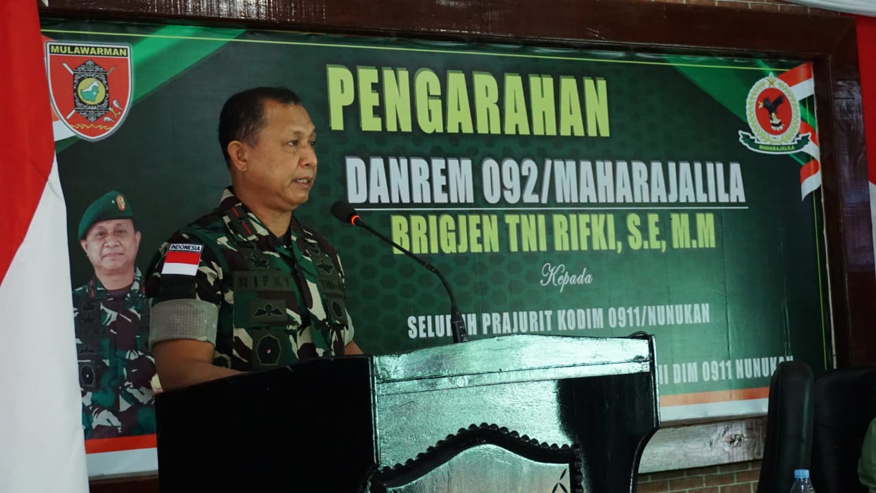 TERASNKRI.COM | NUNUKAN, KALTARA – Komandan Resort Militer (Danrem) 092/Maharajalila Brigjen TNI Rifki, S.E, M.M mengingatkan kepada seluruh prajurit TNI yang bertugas di perbatasan Kabupaten Nunukan, Kalimantan Utara (Kaltara) agar tidak terlibat dalam peredaran dan penggunaan Narkoba, serta terus aktif dalam membantu pemerintah daerah dalam rangka penanganan Covid.