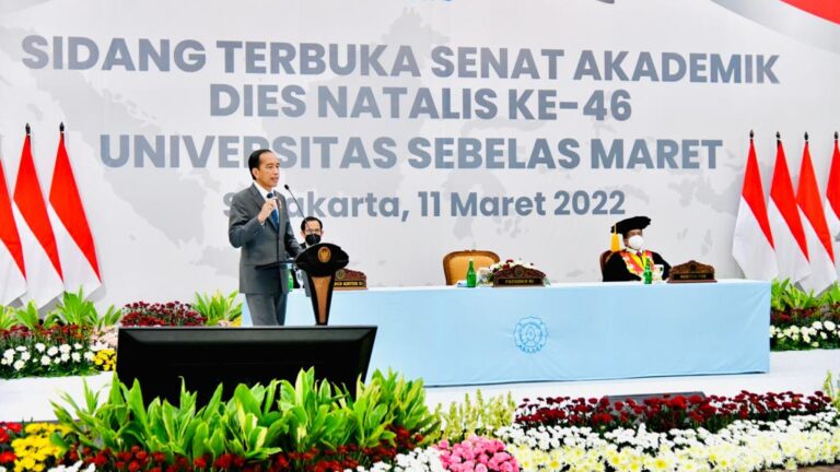 TERASNKRI.COM | Jateng – Presiden Joko Widodo menghadiri Sidang Terbuka Senat Akademik Dies Natalis ke-46 Universitas Sebelas Maret (UNS) yang digelar di UNS Tower Ki Hadjar Dewantara, Kota Surakarta, Provinsi Jawa Tengah, pada Jumat, 11 Maret 2022. Saat menyampaikan arahannya, Presiden terlebih dahulu mengucapkan selamat kepada keluarga besar UNS, sekaligus memberikan apresiasi atas kontribusinya pada kemajuan masyarakat.
