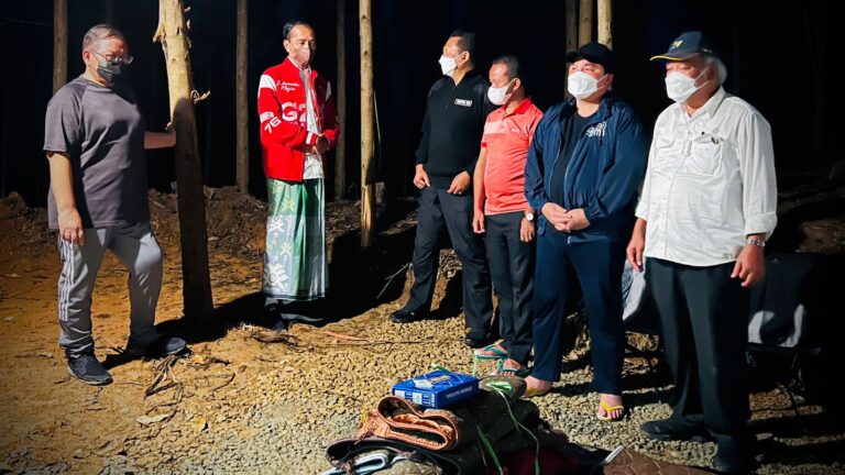 TERASNKRI.COM | PPU, KALTIM – Udara sejuk dan cuaca cerah terasa pada malam hari di Ibu Kota Nusantara (IKN) di tempat Presiden Joko Widodo bermalam, Senin, 14 Maret 2022. Presiden Jokowi yang tampak mengenakan jaket merah bermotif G20 dan sarung bermotif kotak keluar dari tenda tempatnya bermalam sekitar pukul 22.15 WITA.
