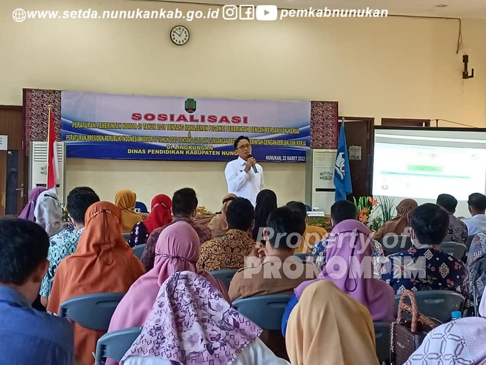 TERASNKRI.COM | NUNUKAN, KALTARA – Dengan memperhatikan serta menindak lanjuti Peraturan Pemerintah Nomor 49 Tahun 2018 tentang Manajemen Pegawai Pemerintah Dengan Perjanjian Kerja serta Peraturan Presiden Republik Indonesia Nomor 18 Tahun 2020 tentang Gaji dan Tunjangan Pegawai Pemerintah Dengan Perjanjian Kerja, Dinas Pendidikan Kabupaten Nunukan melaksanakan kegiatan Sosialisasi kepada PPPK Guru Se Kabupaten Nunukan, dengan menghadirkan Narasumber Kepala Kantor Regional VIII BKN A. Darmuji, S.Sos, M.Si, Kepala Bidang Pengangkatan Dan Pensiun Andi Hikmal, S.Sos, PT. Taspen Gunadi dan Heksa Febriansyah,  bertempat di Aula Pertemuan Dinas Pendidikan Kabupaten Nunukan, Selasa (22/3/2022).