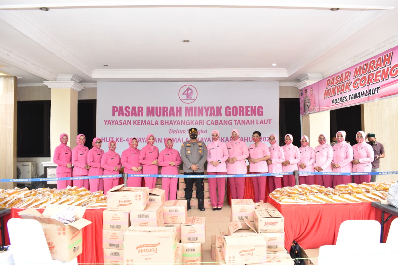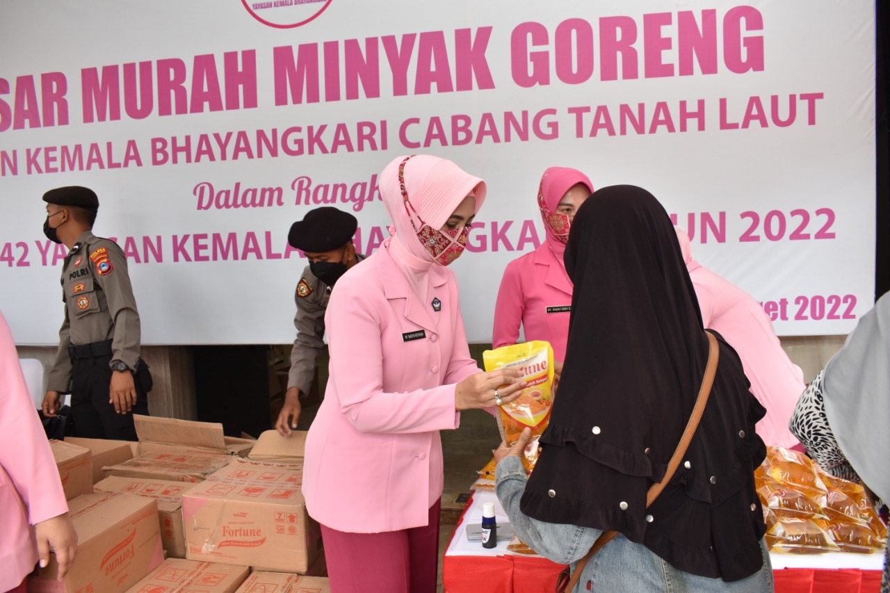 Kapolres Tanah Laut, AKBP Rofikoh Yunianto, S.I.K didampingi Ketua Bhayangkari Cabang Tanah Laut Ny. Nadiya Rofikoh dalam keterangannya di hadapan awak media menjelaskan bahwa pada hari ini kita melaksanakan pasar murah khusus minyak goreng dalam membantu masyarakat dalam mengatasi kelangkaan sembako seperti minyak goreng.