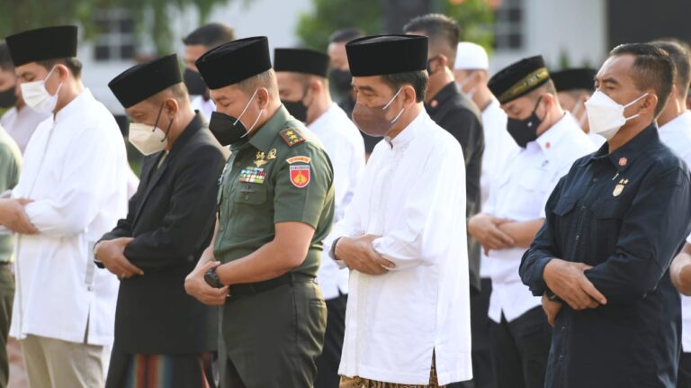 TERASNKRI.COM | Presiden Joko Widodo dan Ibu Iriana Joko Widodo melaksanakan salat Idulfitri di halaman Gedung Agung, Istana Kepresidenan Yogyakarta, pada Senin, 2 Mei 2022, bertepatan dengan 1 Syawal 1443 Hijriah. Salat Idulfitri tersebut diselenggarakan secara terbatas dan diikuti perangkat kepresidenan, Paspampres, dan keluarga pegawai Istana Yogyakarta.