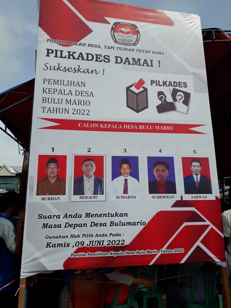 Walupun demikian secara keseluruhan pemilihan kepala desa telah menghasilkan pemimpin yang terbaik dari putra warga Desa Bulu Mario yaitu Muh. Alwi pada nomor urut 2 (Dua) mewakili kalangan anak muda kaum melenial memperoleh 771 suara masih terlalu kuat untuk dikalahkan oleh 4 pesaing politiknya termasuk calon petahana Burhan pada nomor urut 1 menempati posisi kedua dengan 657 suara, sementara nomor urut 4 menempati urutan 3 dengan 185 suara, pada posisi ke 4 dan 5 ditempati oleh Jarwan dan Sumarno dengan 98 dan 52 suara. (Jurhan)