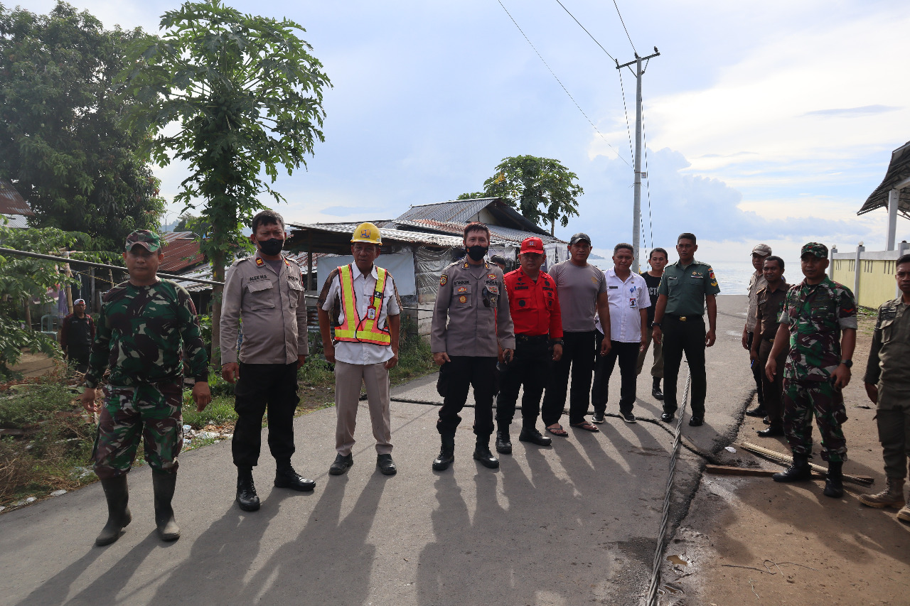 Menggunakan perahu nelayan, Kapolres Minsel AKBP C. Bambang Harleyanto, SIK; bersama Kajari Minsel Budi Hartono, SH, M.Hum, pejabat BPBD, serta pemerintah Kelurahan dan Kecamatan, memantau langsung kondisi kerusakan di area bencana.