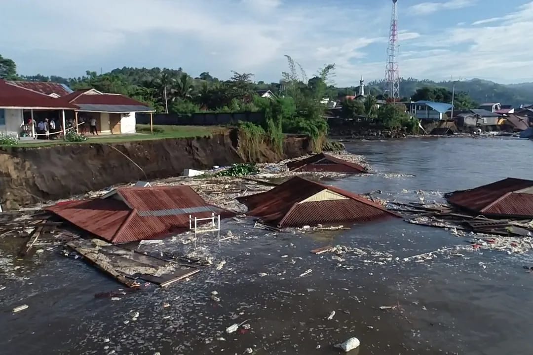 Selain jembatan dan jalan, terpantau sejumlah bangunan rumah warga, fasilitas publik serta sebagian kios Pasar Amurang rusak parah bahkan ada yang tenggelam.