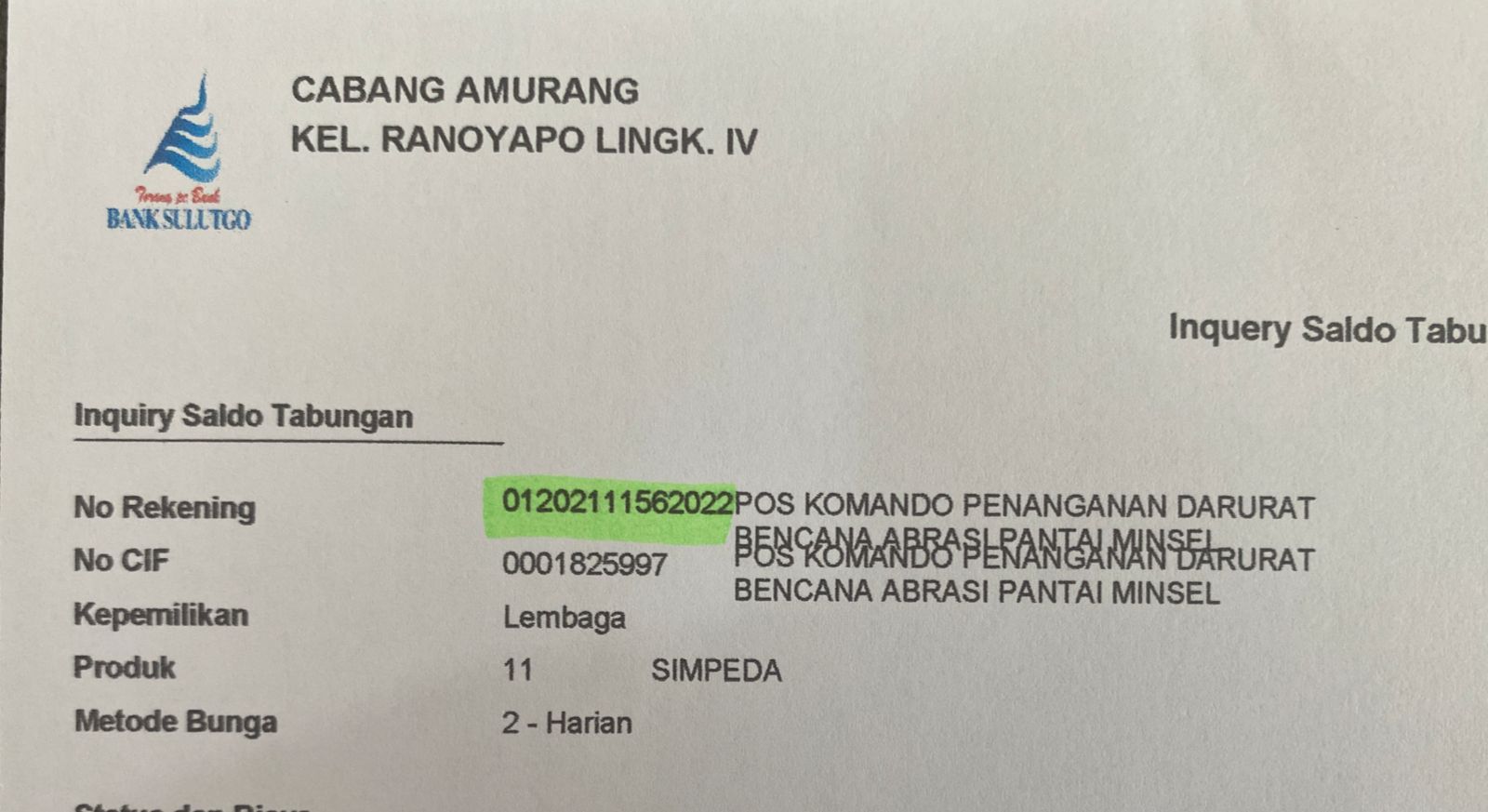 Nomor rekeningnya sudah dibuka yaitu dengan Nomor Rekening BSG: 01202111562022 – Pos Komando Penanganan Darurat Bencana Abrasi Pantai Amurang Minsel.