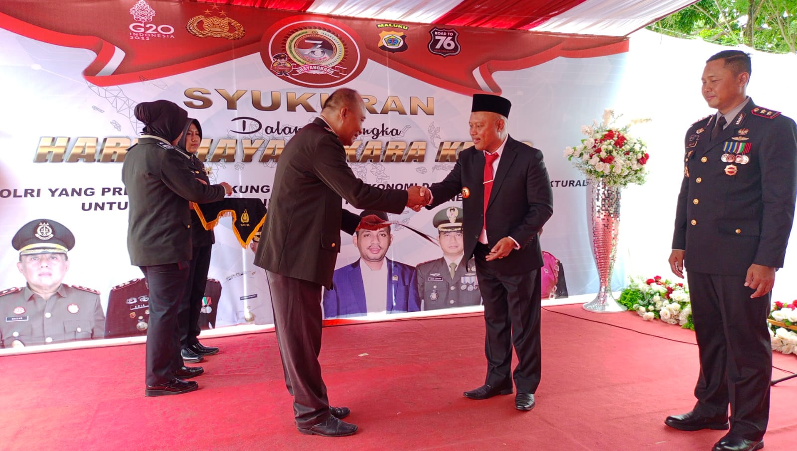 Pada rangkaian upacara HUT ke 76, di lanjutkan dengan acara syukuran yang dilangsungkan dengan pemberian bingkisan dan penghargaan kepada para personil anggota polri dan bhayangkari oleh Kapolres Pulau Buru.