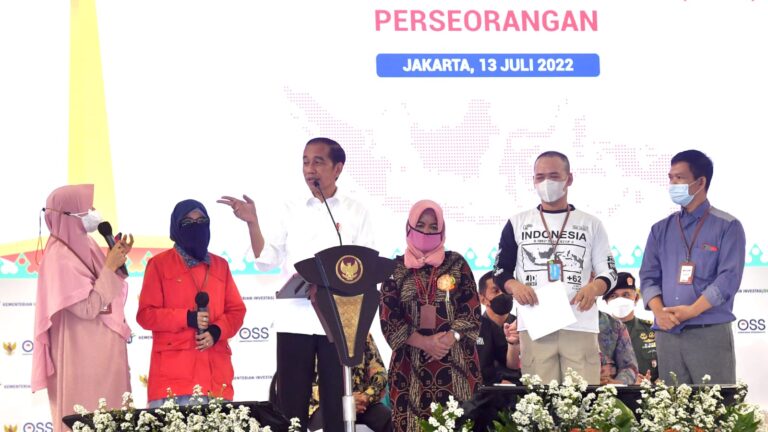 TERASNKRI.COM | JAKARTA – Presiden Joko Widodo mendorong para pelaku usaha mikro, kecil, dan menengah untuk menjual produknya dengan memanfaatkan platform daring guna mendongkrak omzet jualannya. Hal itu disampaikan Presiden usai mendengar cerita sejumlah pengusaha mikro yang sukses meningkatkan usahanya dengan menggunakan berbagai aplikasi daring pada acara Pemberian Nomor Induk Berusaha (NIB) Pelaku Usaha Mikro Kecil (UMK) Perseorangan Tahun 2022 di Gedung Olahraga Nanggala Kopassus, Jakarta, Rabu, 13 Juli 2022.