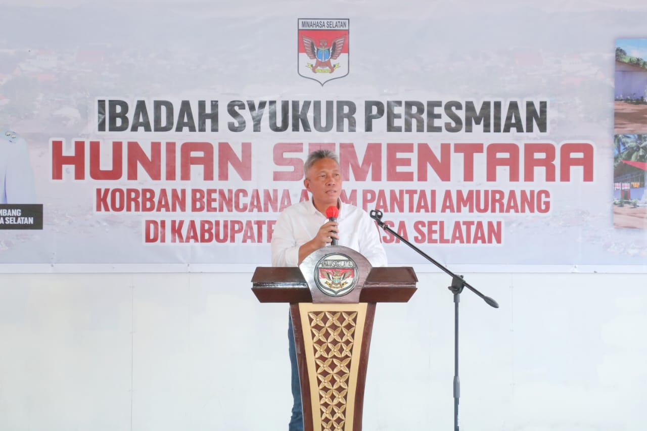 Bupati MinselFranky Donny Wongkar, SH dalam sambutannya menyampaikan, “kiranya seluruh warga korban terdampak bencana yang akan menempati Huntara ini bisa tinggal dengan nyaman serta tetap menjaga kerukunan yang ada, meskipun banyaknya kendala dalam upaya penanggulangan pasca bencana ini, namun pemerintah tetap optimis dengan melakukan yang terbaik bagi warga terdampak bencana, proses pekerjaan pembangunannya dilakukan secara mapalus (gotong-royong) dengan melibatkan semua ASN, THL masyarakat yang ada di Minahasa Selatan, TNI, POLRI juga membantu kami dalam pelaksanaan pembangunan hunian sementara ini.”