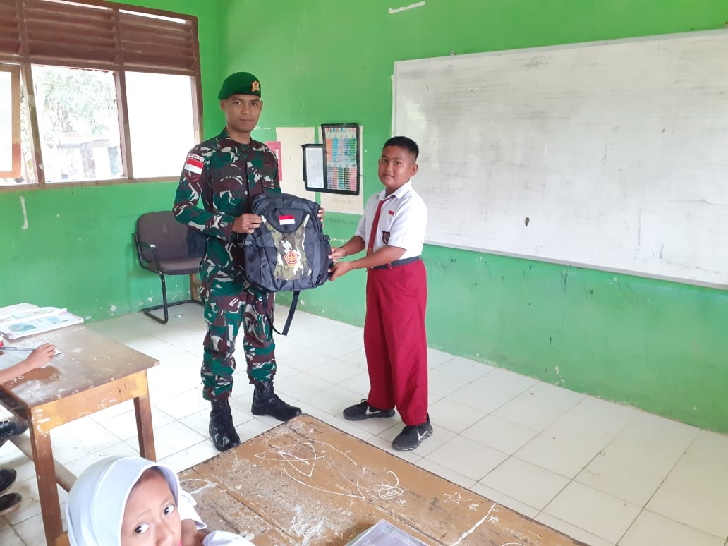 TERASNKRI.COM | Nunukan, Kaltara – Kegiatan Bantuna Gadik (Tenaga Pendidik) serta penyerahan Sargal berupa tas dan baju Mabes TNI di SDN 004 Sei Manggaris oleh Pos Kanduangan Satgas Pamtas Darat RI-MLY Yonif 621/Mtg, Sabtu (10/09/2022)